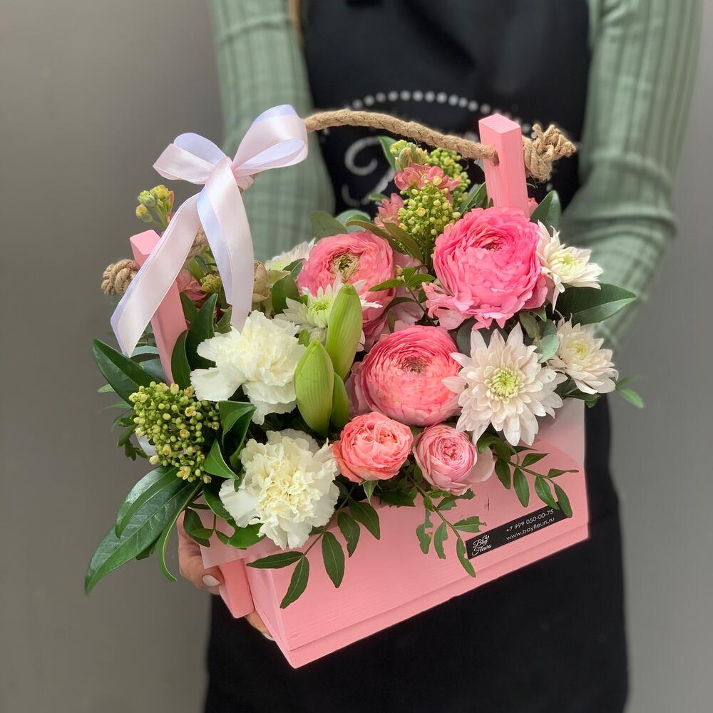 Ящик деревянный – 1 шт.Оазис флористический – 1 шт.Ранункулюс – 3 шт.Хризантема кустовая – 1 шт.Гвоздика – 2 шт.Скиммия – 1 шт.Маттиола белая – 1 шт.Кустовая роза розовая – 1 шт.Лента атласная – 2 шт.зелень декоративная – 2 шт.
