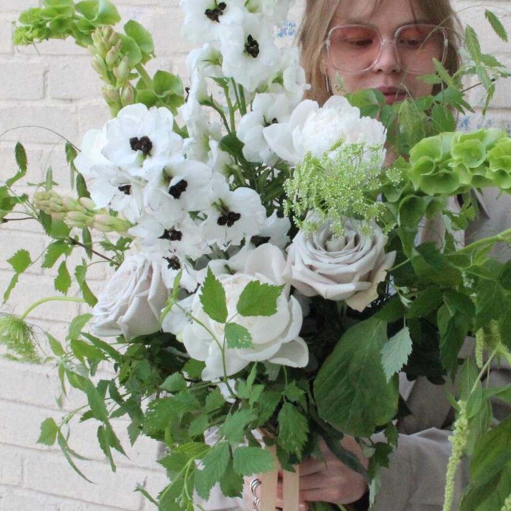 дельфиниумом – 3 шт.Амарант – 1 шт.ирландский колокольчик – 2 шт.Ветки малины – 4 шт.Тубероза – 2 шт.Роза Мента – 2 шт.Пион – 3 шт.Амми – 3 шт.Фисташка – 3 шт.Лента атласная – 1 шт.