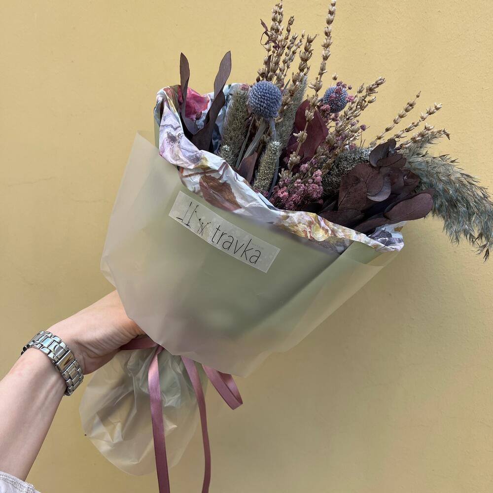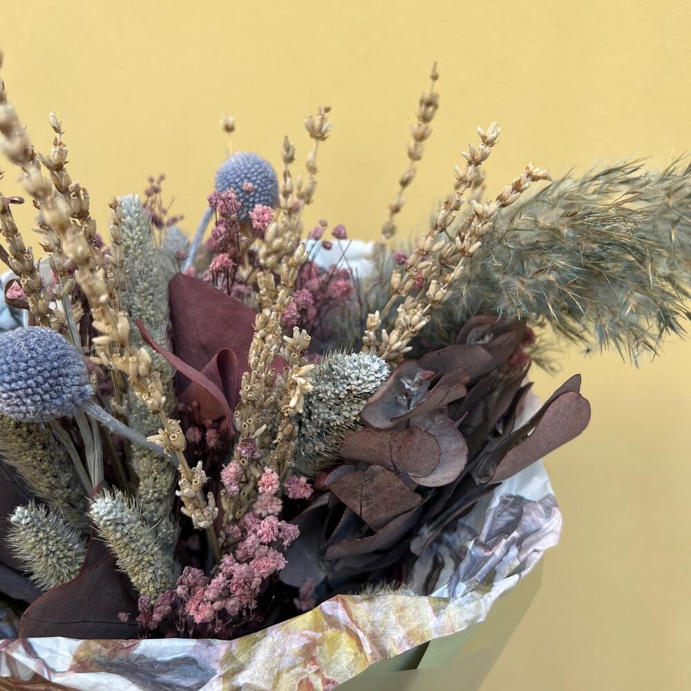 Краспедия – 2 шт.кортадерия – 1 шт.Эвкалипт – 3 шт.Лаванда – 10 шт.гипсофила сухоцвет – 5 шт.пушистики – 5 шт.