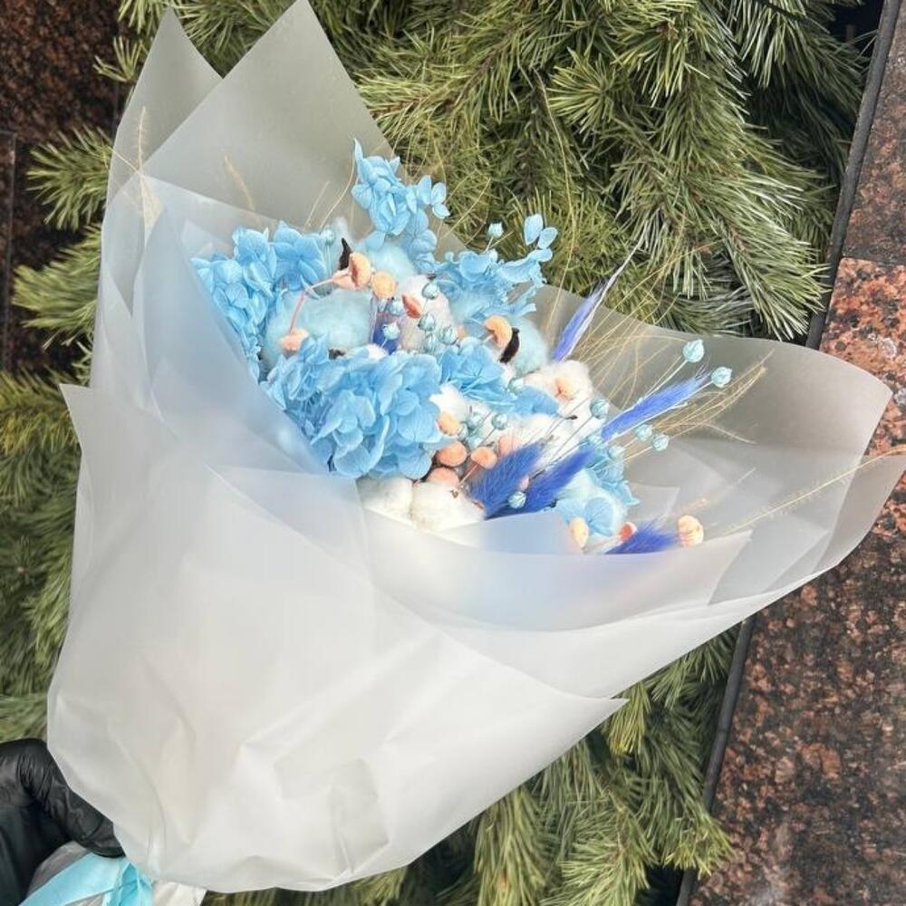 гортензия стабилизированная – 4 шт.Лагурус – 20 шт.Ковыль – 25 шт.ботао – 20 шт.Упаковка дизайнерская – 6 шт.Лента атласная – 1 шт.
