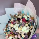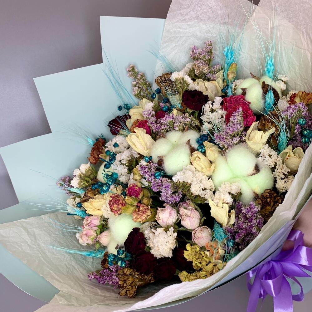 Хлопок – 5 шт.Лента атласная – 3 шт.Тишью – 1 шт.Сухоцветы – 40 шт.Тритикум(пшеница) – 15 шт.Дизайнерская упаковка – 2 шт.лимониум сухоцвет – 15 шт.статица сухоцвет – 9 шт.абрус сухоцвет – 20 шт.