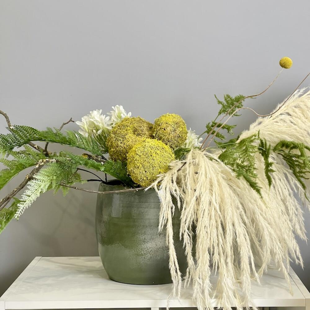 картадерия сухоцвет – 2 шт.плюмозус искусственный – 2 шт.агапантус искусственный – 3 шт.коряга натуральная – 1 шт.шары из натурального мха – 3 шт.краспедия сухоцвет – 2 шт.папоротник искусственный – 4 шт.Кашпо керамика – 1 шт.