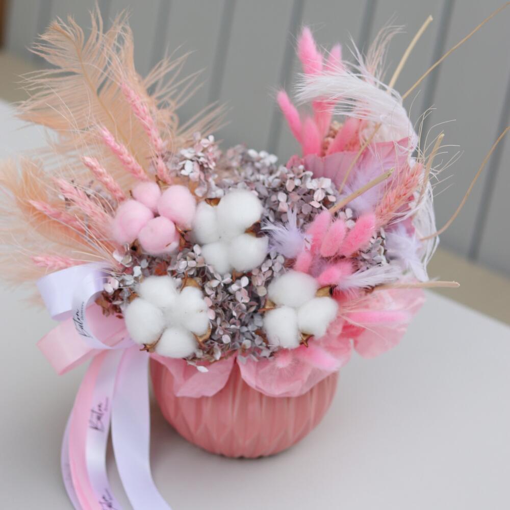 Гортензия – 3 шт.Хлопок – 4 шт.Пальма – 1 шт.Колосья – 8 шт.Лагурус – 16 шт.Кашпо керамическое – 1 шт.Открыточка с вашими пожеланиями – 1 шт.Шоколадка – 1 шт.перо декоративное – 3 шт.ветки декоративные – 2 шт.