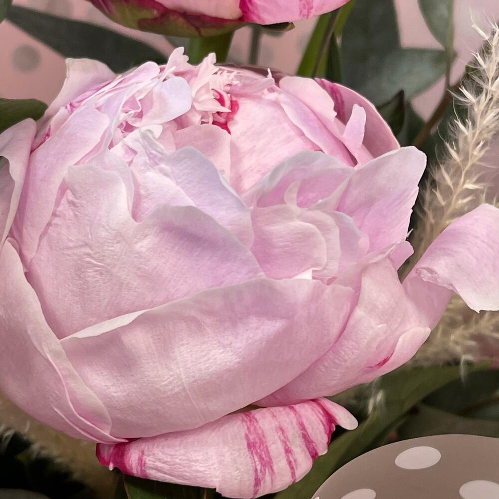Пион – 7 шт.Лагурус – 5 шт.Эвкалипт – 1 шт.пампасная трава (сухоцвет) – 1 шт.Упаковка дизайнерская – 1 шт.Лента – 1 шт.