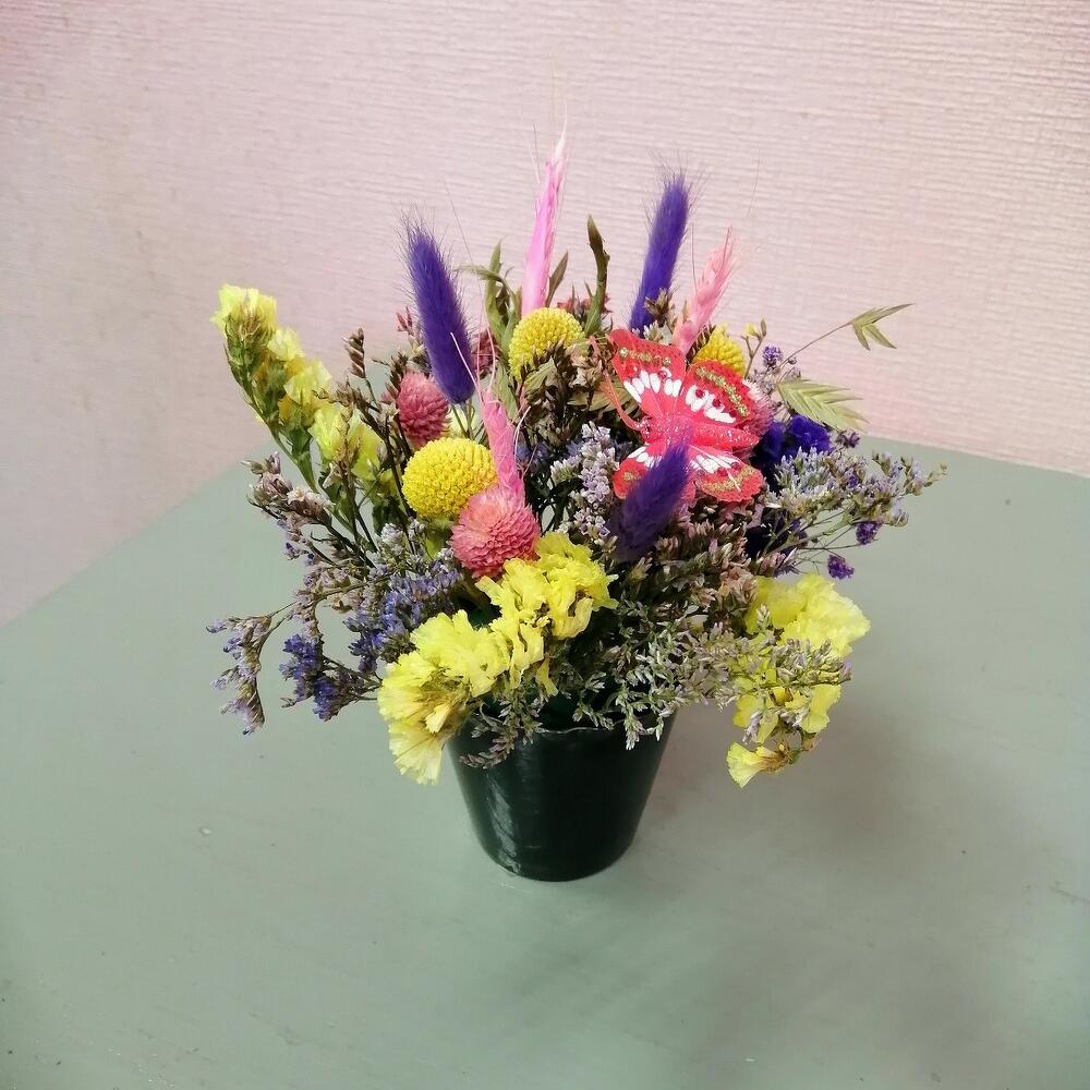 Краспедия желтая – 3 шт.Лагурус (сухоцвет) – 4 шт.Пшеница (сухоцвет) – 3 шт.Статица – 1 шт.Лимониум – 1 шт.Бабочка декоративная – 1 шт.Оазис флористический – 1 шт.Кашпо керамическое – 1 шт.