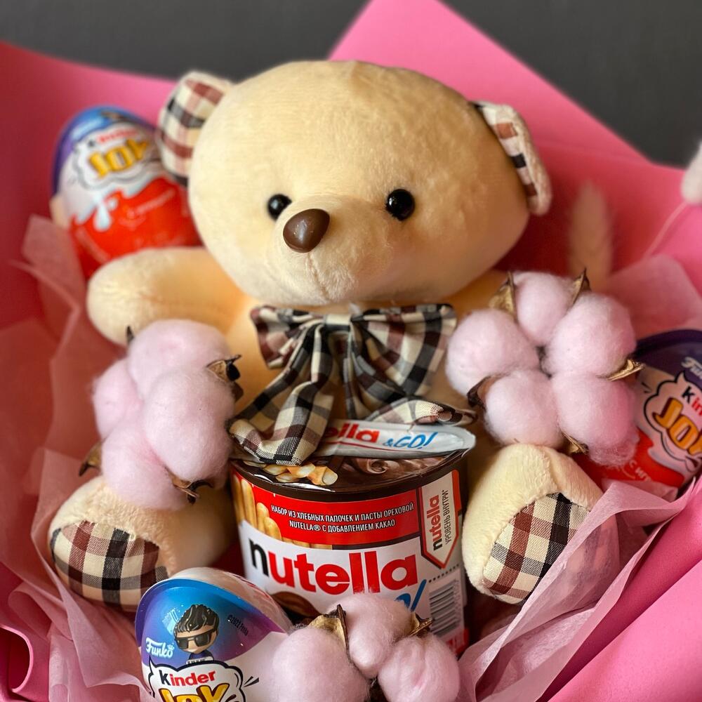 Мишка плюшевый – 1 шт.Хлопок натуральный – 3 шт.Киндер сюрприз – 3 шт.нутелла го – 1 шт.Сухоцветы – 3 шт.Тишью розовая – 1 шт.Стильная упаковка – 3 шт.Лента атласная – 1 шт.Прозрачная пленка – 1 шт.