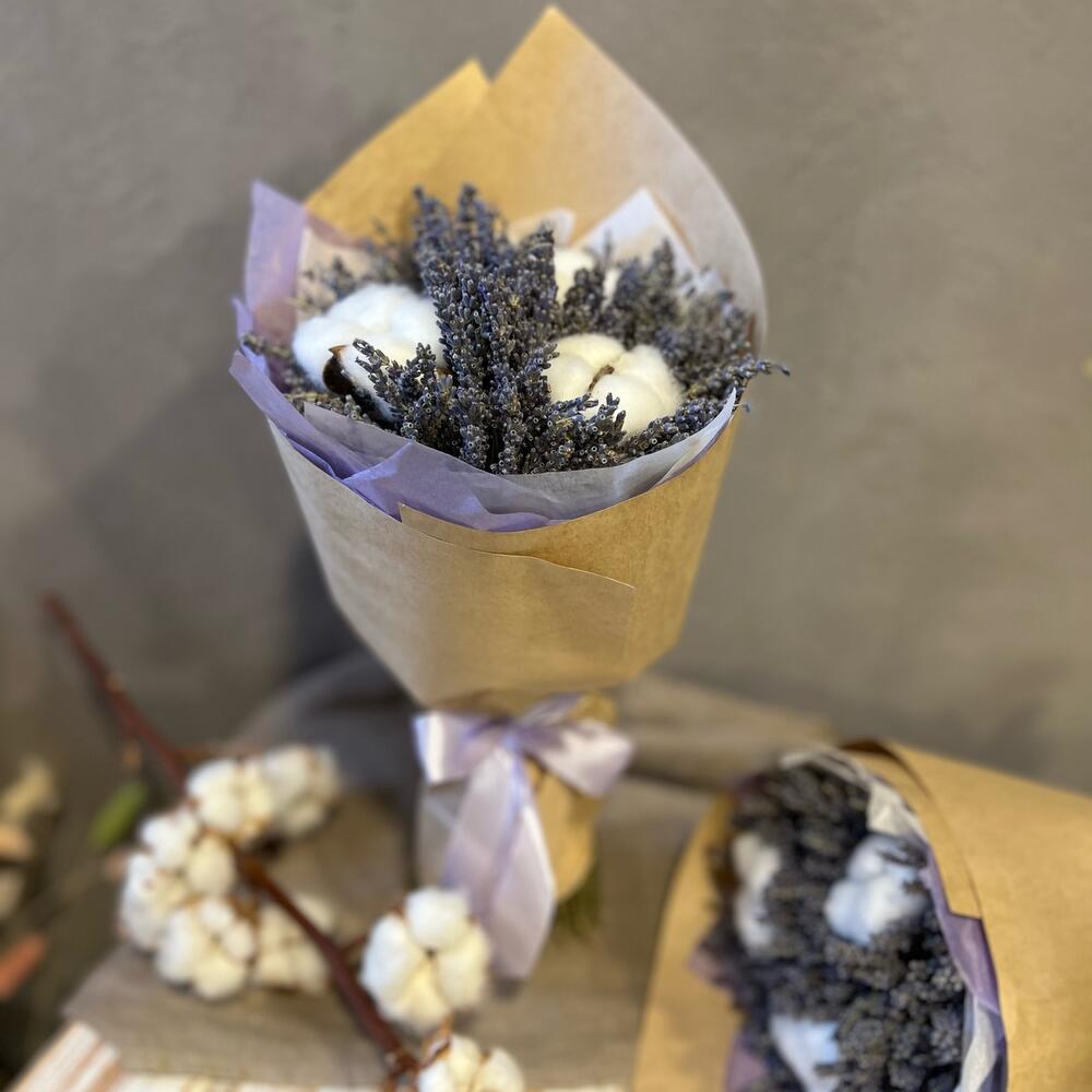 лаванда банч сухоцвет – 1 шт.Хлопок натуральный – 3 шт.Упаковка дизайнерская – 1 шт.