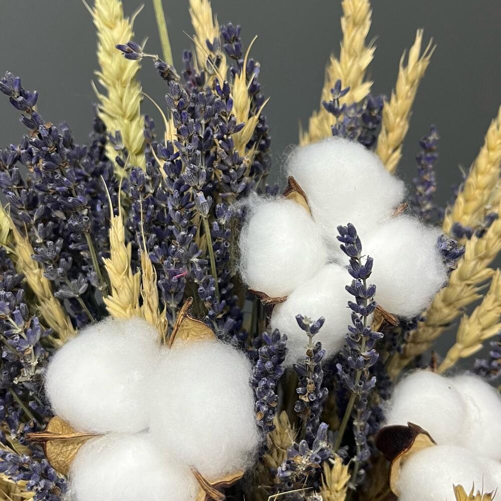Хлопок натуральный – 3 шт.бечевка натуральная – 1 шт.лаванда сухоцвет банч – 1 шт.пшеница (сухоцвет) банч – 1 шт.