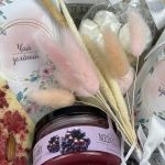 крем-мед 100мл – 2 шт.Чай черный – 50 гр.Чай зеленый – 50 гр.пакетик с разноцветным безе – 1 шт.шоколад ручной работы с ягодами и орехами – 70 гр.букетик сухоцветов – 1 шт.