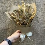 Лента атласная – 1 шт.Пшеница – 10 шт.Овес – 5 шт.Корейская упаковка – 1 шт.тысячелистник сухоцвет – 3 шт.искуственные листья – 3 шт.злак метелка – 5 шт.