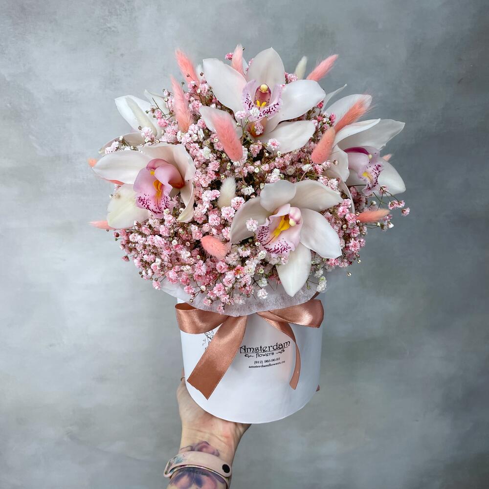 коробка шляпная d15 – 1 шт.Оазис – 1 шт.Орхидея Цимбидиум – 7 шт.гипсофила персиковая – 15 шт.Лагурус – 30 шт.