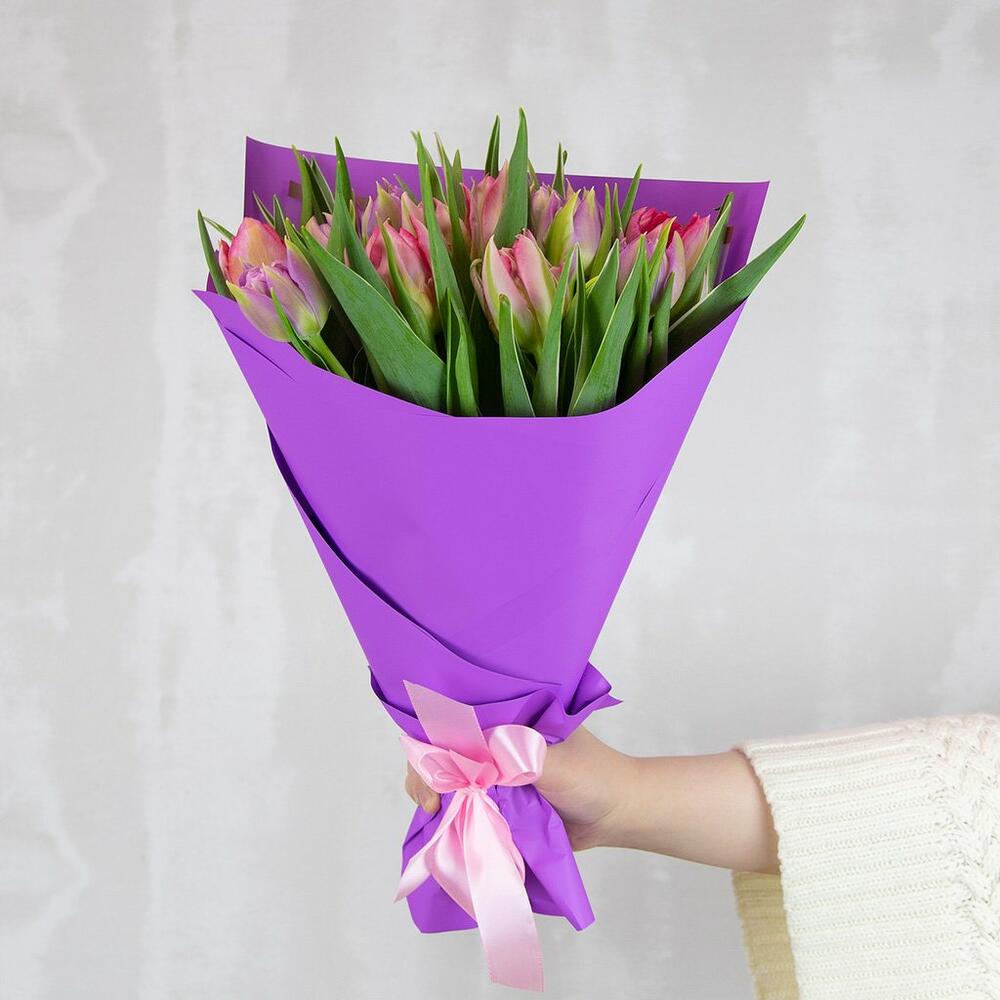 Букет из 15 тюльпанов пионовидных микс в дизайнерской упаковке