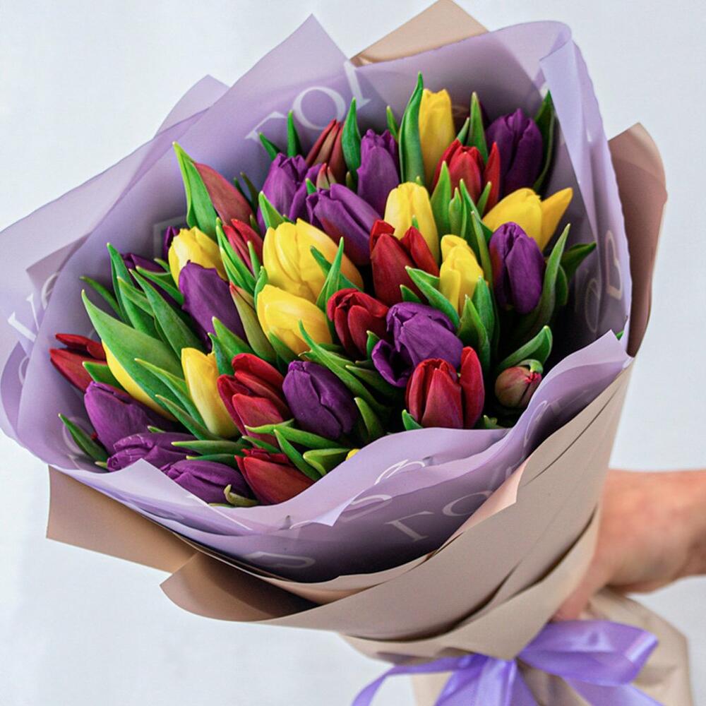 Букет из 35 тюльпанов стандарт яркий микс в упаковке