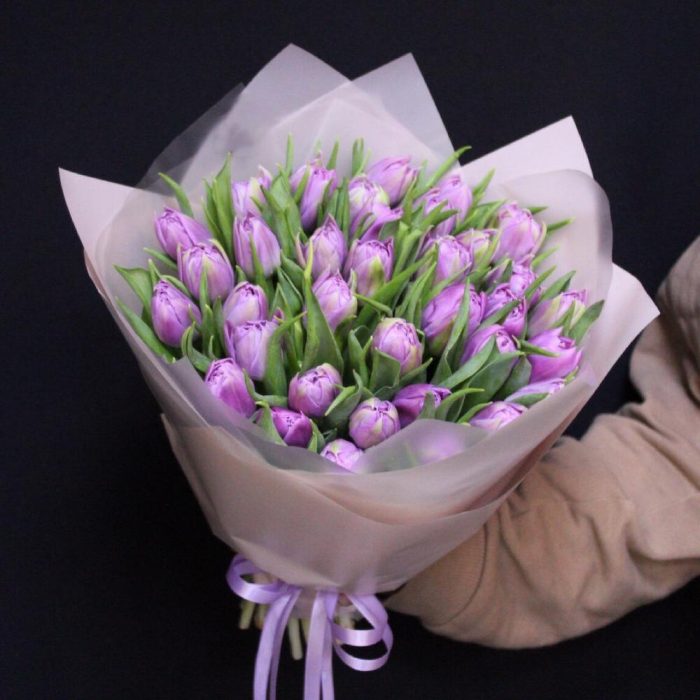 Тюльпан пионовидный дабл прайс – 35 шт.Пленка дизайнерская – 3 шт.Лента атласная – 1 шт.